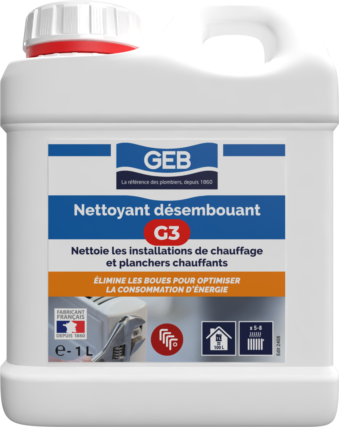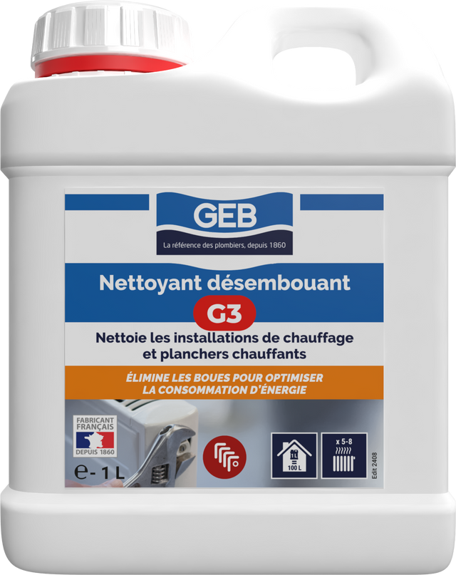 Le nettoyant désembouant G3 GEB est conçu pour nettoyer efficacement les installations de chauffage, quel que soit leur âge. Il permet d’éliminer les boues et dépôts accumulés dans les circuits, assurant ainsi un fonctionnement optimal du système.