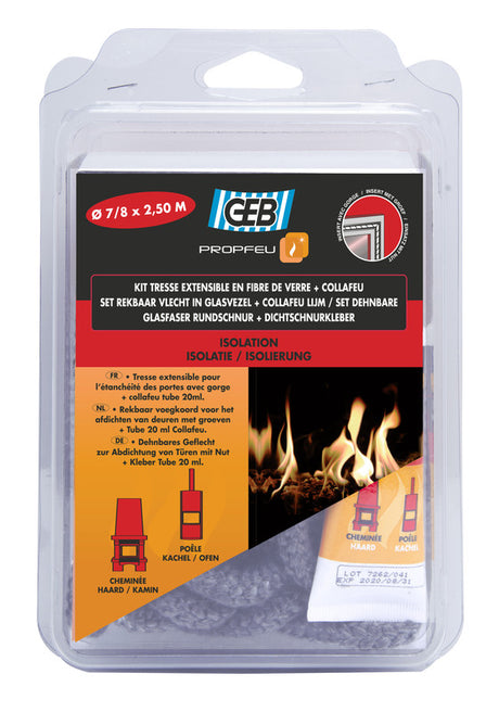 Kit complet GEB Tresse ronde 2,5m Ø 7 à 8mm en fibre de verre + Colle réfractaire Collafeu 20 ml