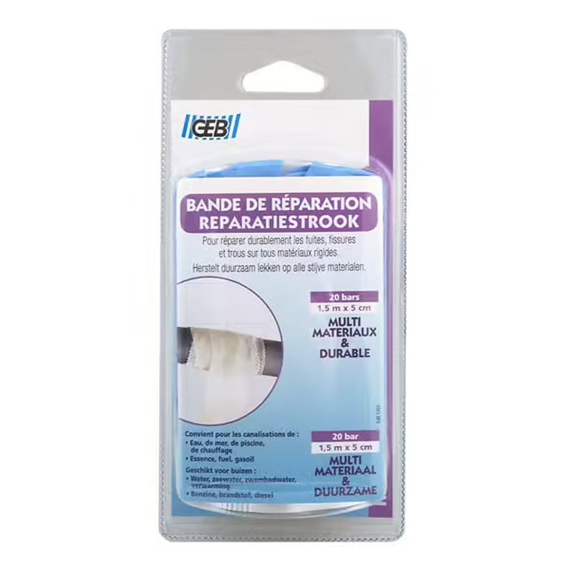 Cette bande de réparation GEB est conçue pour tous matériaux rigides et se présente en format pratique de 19,5 x 9,5 x 5 cm. Marque : GEB. Matériau : Fibre de verre enduite de résine polyuréthane. Utilisation : Réparation de fuites, fissures et trous sur supports rigides.