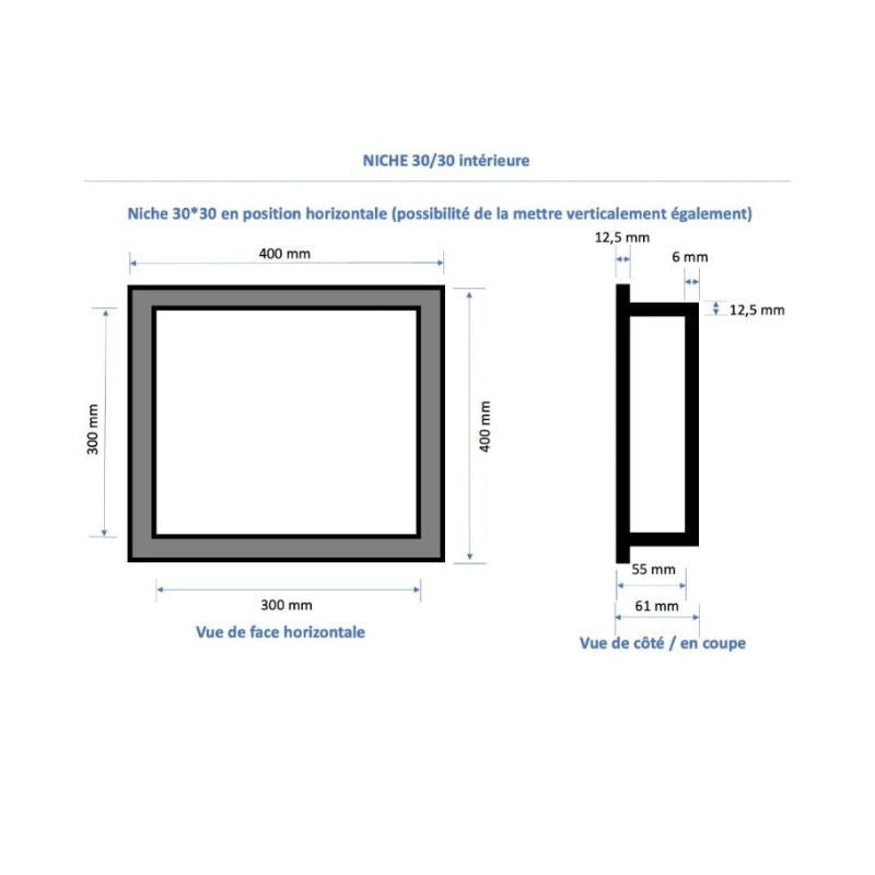 Caractéristiques techniques Duo de niches à carreler étanche MARMOX DUONICHE30/30-INT - Format intérieur 30x30cm - Profondeur 6cm