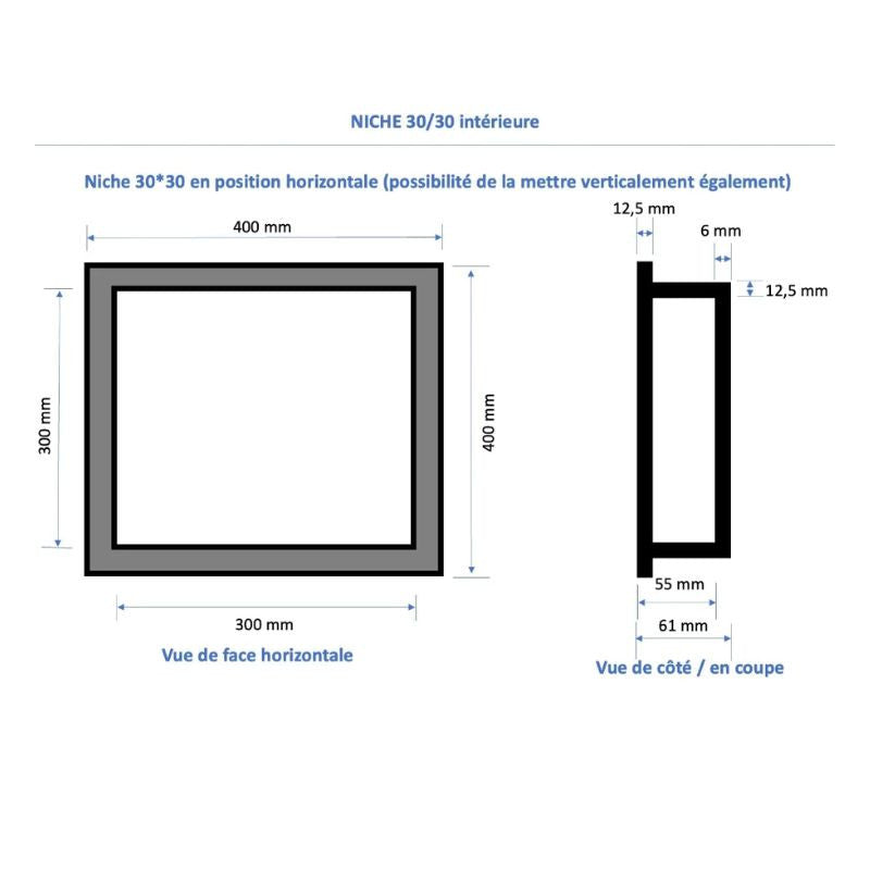 Caractéristiques techniques Niche à carreler étanche MARMOX NICHE30/30-INT - Format intérieur 30x30cm - Profondeur 6cm