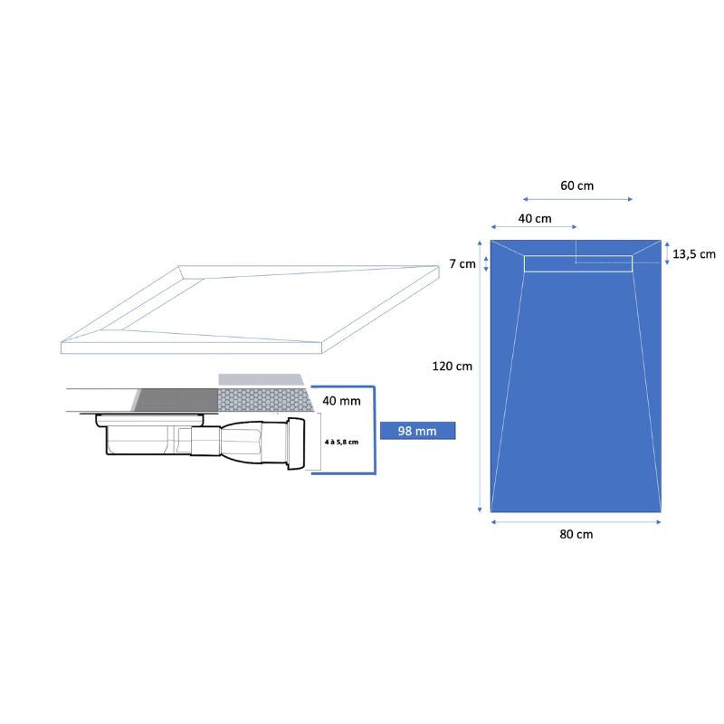 Caractéristiques techniques Receveur résine extra-plat MARMOX RC12080LITE-7015-LINE - Grille caniveau excentrée - Natte étanche pré-montée - Gris imitation ardoise - 120x80cm