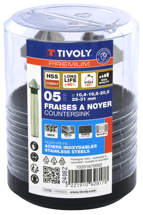 Tivoly Coffret 5 fraises à noyer HSSE5% cobalt DIN335C à 90° Ø 10,4 à 31 mm PREMIUM