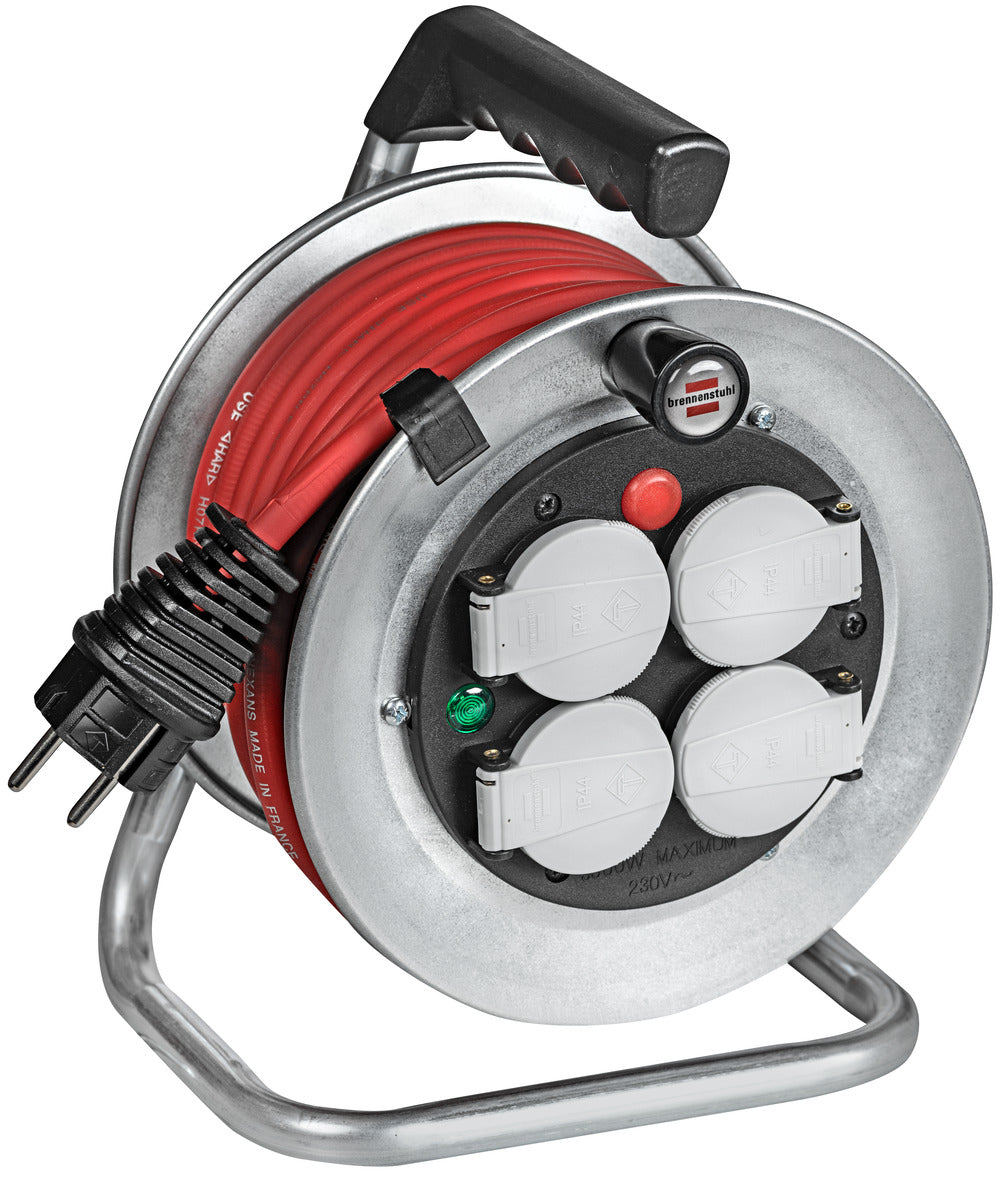 Enrouleur SILVER-10 Professional 10m IP44 - 4 prises + fiche. 1000W/3500W. Voyant tension. Support acier galvanisé.