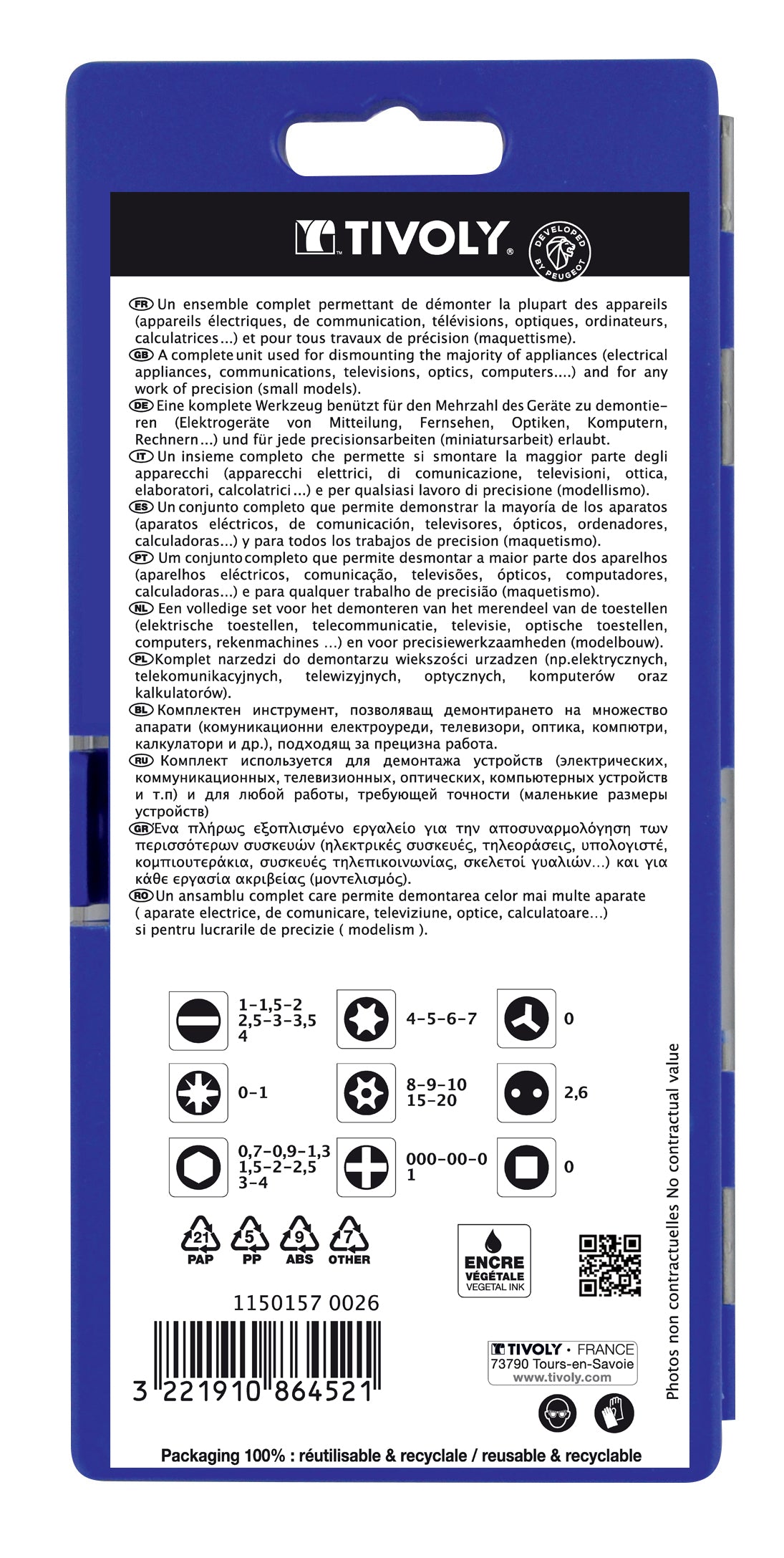 35 pièces -33 embouts de précision+ 1 porte-embout magnétique + 1 tournevis / Un ensemble complet permettant de démonter la plupart des appareils(appareils électriques, de communication, télévisions, optiques, ordinateurs, calculatrices ...) et pour tout travaux de précision (maquettisme) Queue hexagonale 4mm : spécifique pour les embouts de précision.=> Pour les embouts de très petites dimensions conçus pour un usage manuel avec poignée de vissage. Avec Bague de couleur différente en fonction des empreintes=> Pour une reconnaissance facilitée et rapide des types d'empreintes. A chaque empreinte son code couleur.