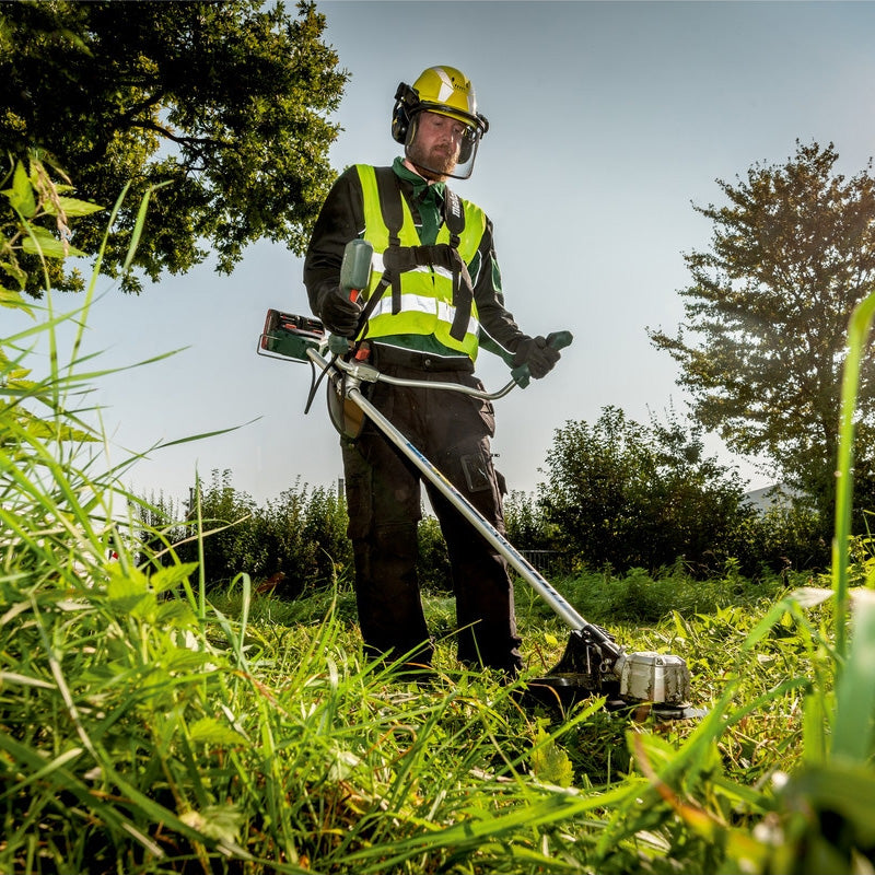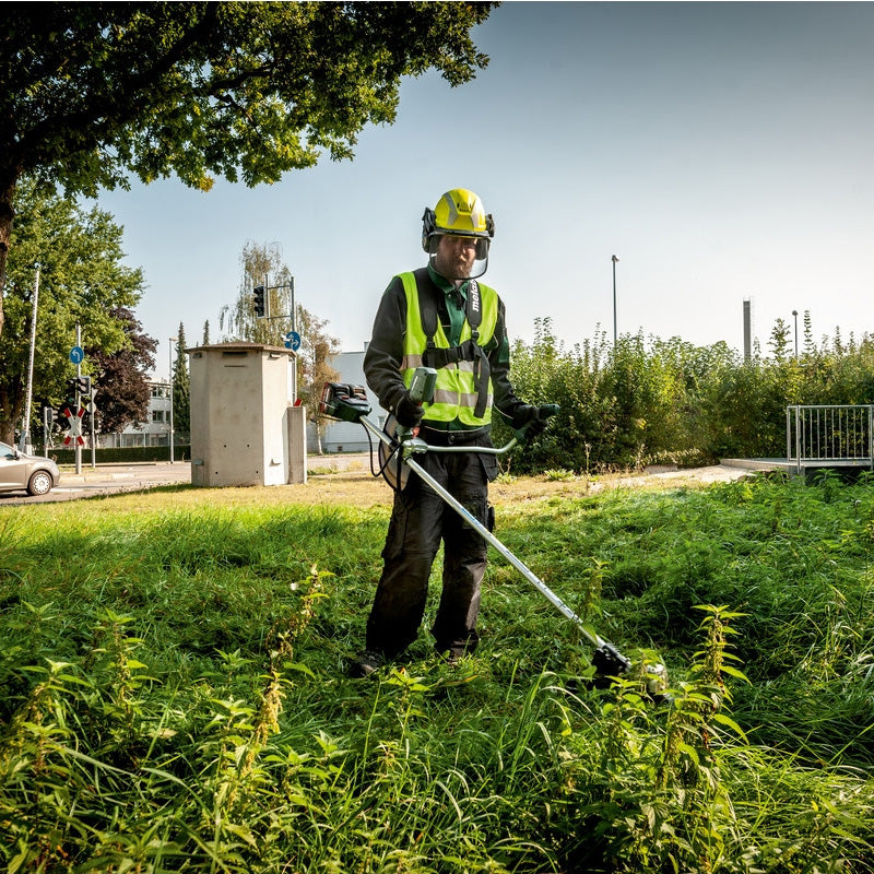 La débroussailleuse fonctionne avec deux batteries 18 V Li-Ion pour un total de 36 V. Le régime à vide est de 0 à 6000 tr/min. Le diamètre de coupe atteint 40 cm, avec un fil nylon de 2,0 mm de diamètre. Le poids est d’environ 3,9 kg sans batteries et 4,7 kg avec batteries.