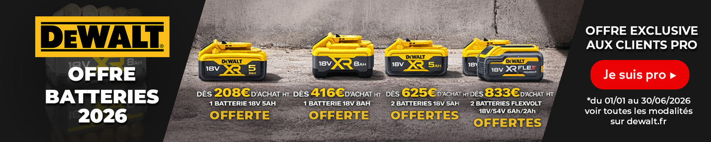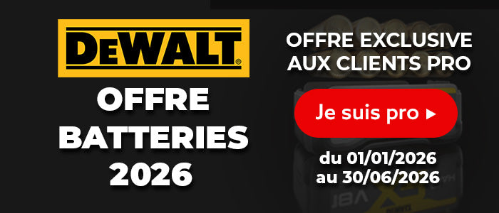 Du 1er janvier au 30 juin 2026, pour tout achat simultané d’un ou plusieurs produits de la marque DEWALT, bénéficiez d’une batterie offerte ou d’un pack de 2 batteries selon le montant total de vos achats.