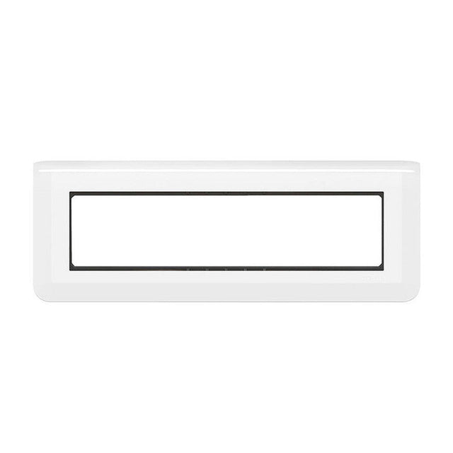 Plaque de finition blanche horizontale pour habiller les fonctions Mosaic jusqu'à 8 modules livrée avec support pour installation à vis sur boite à encastrer.