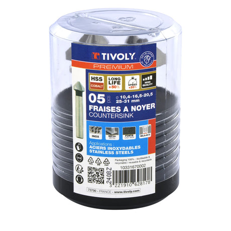 Tivoly Coffret 5 fraises à noyer HSSE5% cobalt DIN335C à 90° Ø 10,4 à 31 mm PREMIUM