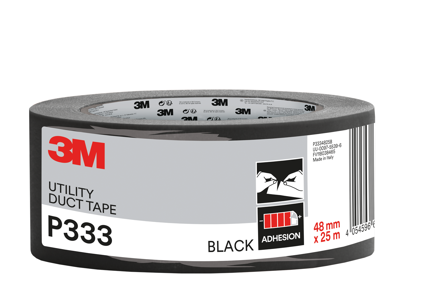 3M™ P333 - Toile de réparation noir 25m x 48mm. Réparation, fixation, renfort, maintien définitif ou provisoire. Produit très résistant à forte adhésivité. S'applique sur toutes les surfaces, même légèrement poussiéreuses. Facile à utiliser, il se découpe manuellement. Il peut également être utilisé pour la maintenance générale, l’emballage, l’empaquetage ou encore étanchéifier. Se coupe à la main.