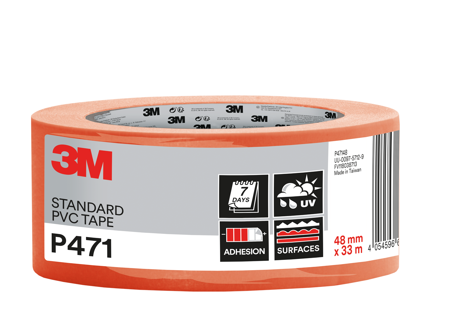 3M™ P471R - PVC Souple adhésif tous travaux qualité professionnelle orange 33x48mm. Ruban PVC polyvalent pour la réparation ou le masquage extérieur sur la plupart des surfaces. Il est flexible et conformable et convient aux surfaces rugueuses. Le ruban est résistant aux UV et s'enlève facilement jusqu'à 7 jours après l'application