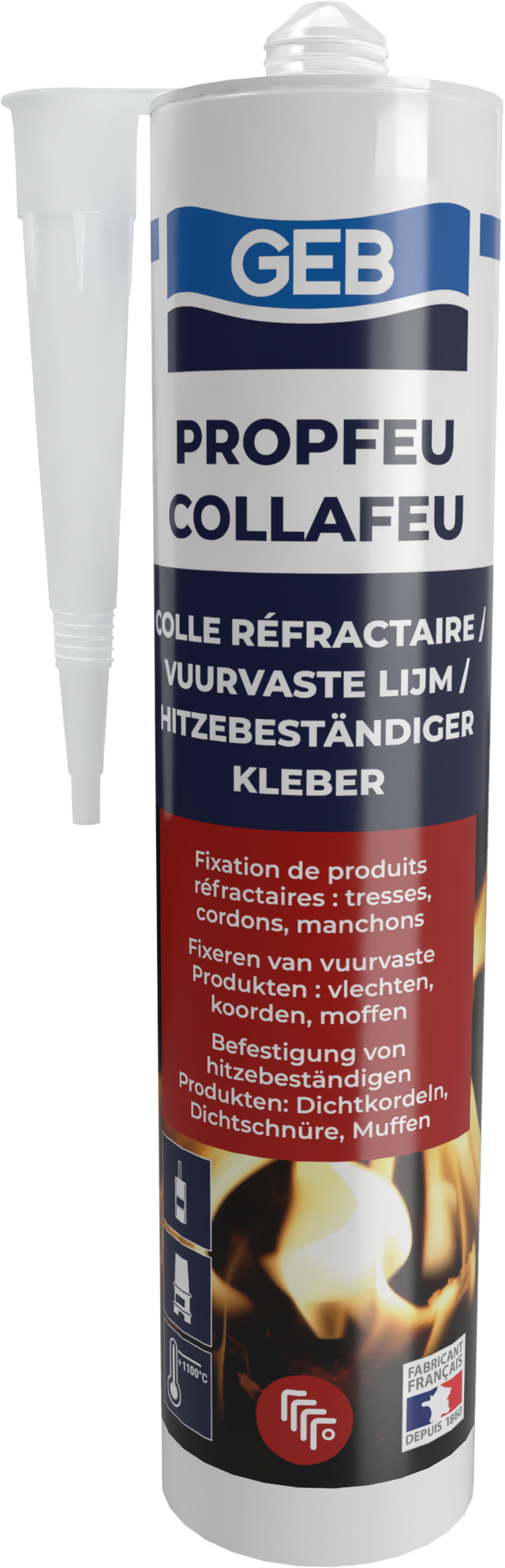 La colle réfractaire GEB Collafeu permet de fixer solidement des briques réfractaires, gaines, tresses ou cordons, offrant une tenue exceptionnelle en températures élevées jusqu'à 1100°C. Elle est idéale pour les cheminées, poêles ou cuisinières à bois ou charbon, assurant un montage durable et résistant à la chaleur.