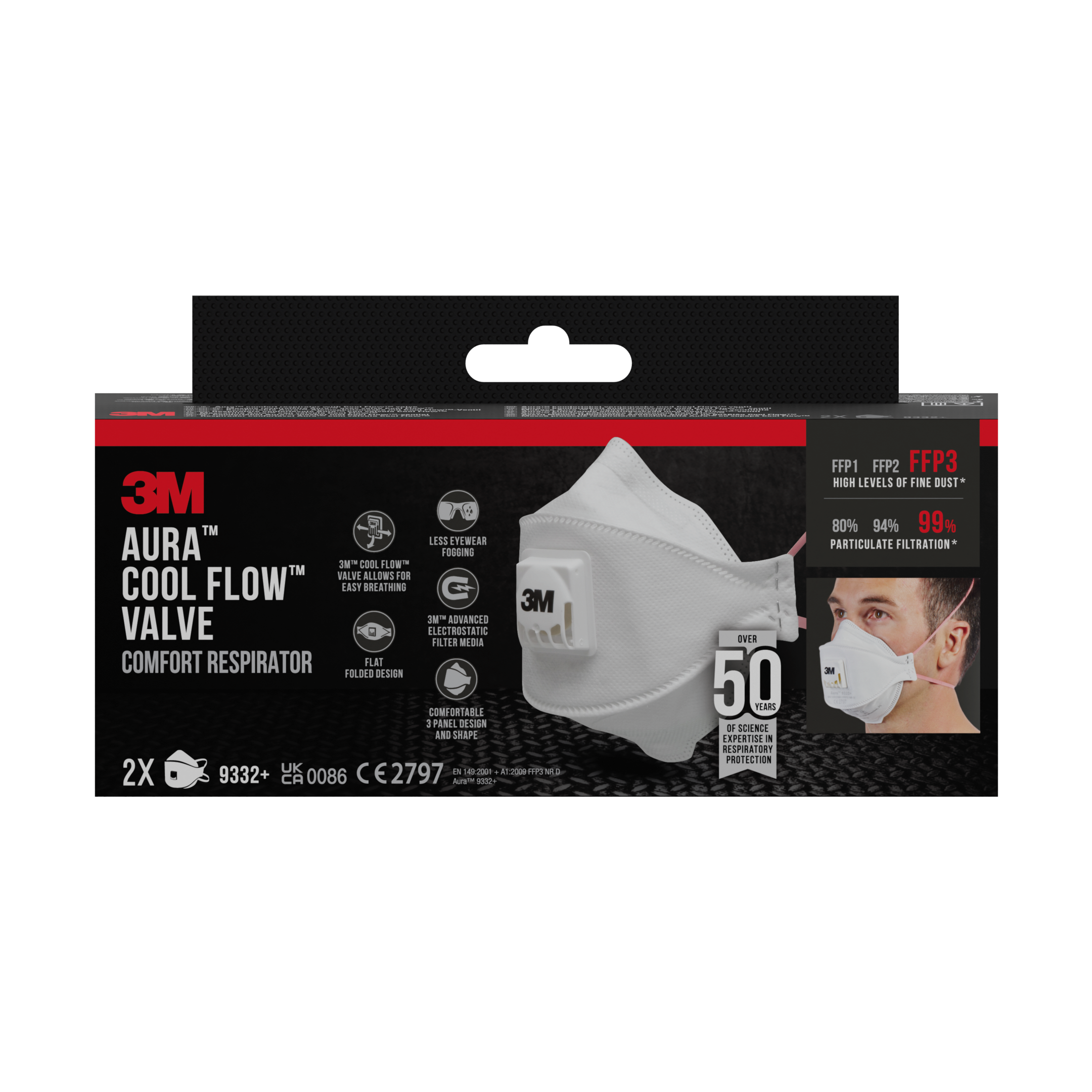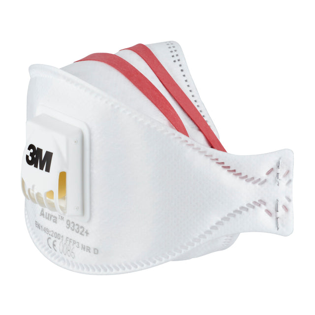 Masque Pliable 9332 FFP3 Soupape Toxique x2. Protection respiratoire légère, confortable et efficace contre les poussières et les brouillard. Masque protection contre un niveau de poussières élevé, matériaux d'isolation, ponçage électrique du sol bois dur (frêne, tremble, bouleau, merisier, orme, acajou, érable, chêne, noyer), réparation de mur paroi en fibre de verre. Le port de ce masque respiratoire est compatible avec le port d'autres équipements de protection individuelle : lunettes de protection et/ou casque de protection auditive. Pliable et facilement stockable grâce à ses 3 panneaux. Très doux et confortable à porter - Faible résistance respiratoire grâce à la soupape expiratoire : réduit la chaleur et l’humidité. Sa conception en trois panneaux permet d'épouser la forme du visage et de s'adapter à chaque mouvement. Le panneau nasal sculpté, incurvé et profilé dégage le champs de vision et accroit la compatibilité avec les lunettes de protection. NORME FFP3 : niveau élevé de protection. La soupape 3M™ Cool FLow™ dissipe efficacement la chaleur accumulée pour plus de fraîcheur, de confort et réduit le risque de formation de buée sur les lunettes. La barrette nasale est ajustable pour s’adapter à toutes les morphologies de visages - La coquille interne est résistante à l'écrasement ce qui permet d'allonger la durée de vie du masque. ELa double bride élastiqué offre un plus grand confort.