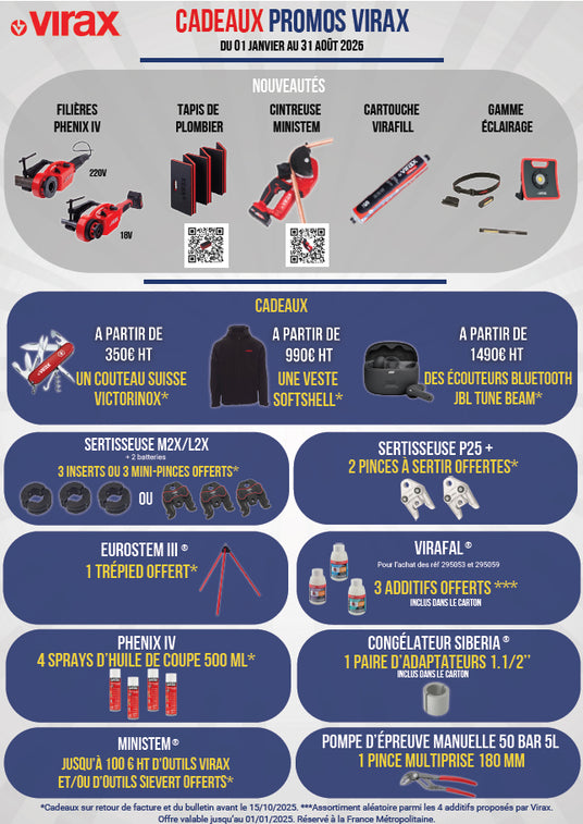 Découvrez l'offre cadeau de la marque Virax ! Profitez de belles récompenses selon le montant total de vos achats de produits Virax ou en achetant un outil Virax spécifique.