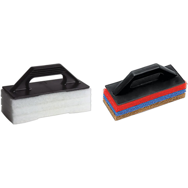 Support avec abrasifs de dimensions 25 cm x 10 cm et épaisseur 2,5 cm. Trois niveaux de dureté inclus : doux (rouge), moyen (bleu), fort (marron). Manche ergonomique en plastique. Système de fixation rapide. Compatible avec les produits à base acide. Conçu pour le nettoyage et l’entretien des surfaces en céramique et autres matériaux de revêtement.