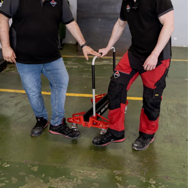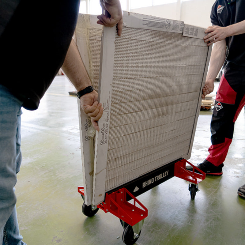 Le chariot RHINO dispose d’une capacité maximale de 250 kg et peut transporter plusieurs carreaux jusqu’à 40 mm d’épaisseur. Les roues de 125 mm de diamètre sont adaptées à toutes les surfaces et équipées d’un système de sécurité pour éviter tout mouvement indésirable.