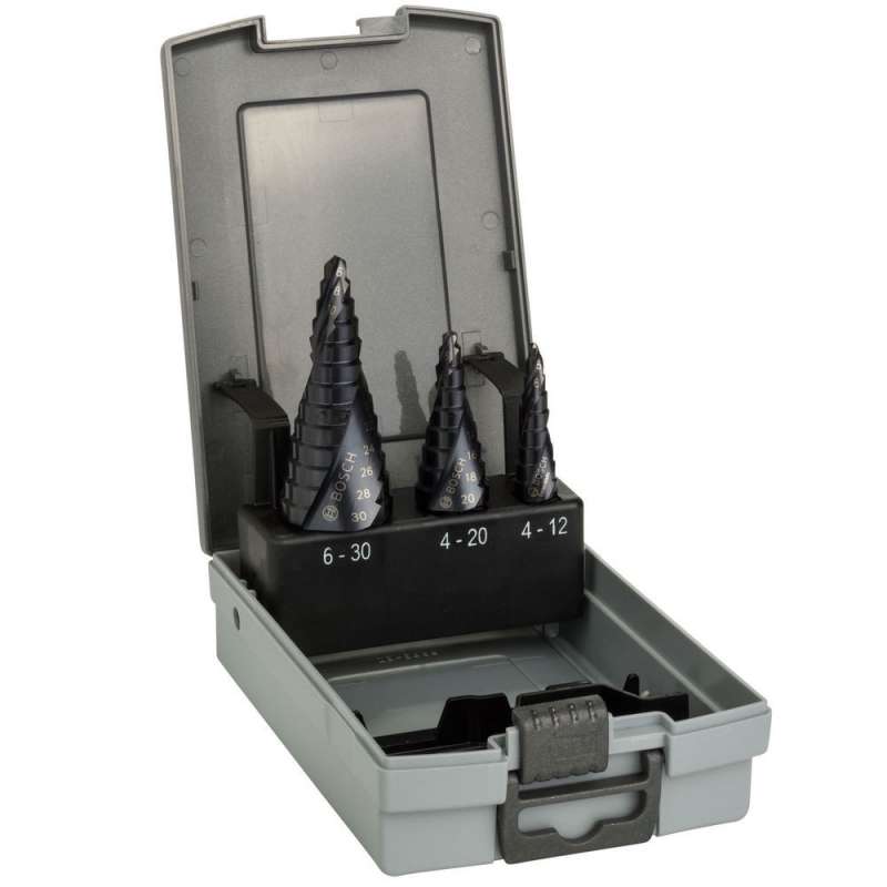 Coffret de 3 Fraises étagées Bosch Pro 2608588069 HSS-AlTiN queue 3 pans - Ø 4-12 / 4-20 / 6-30mm
