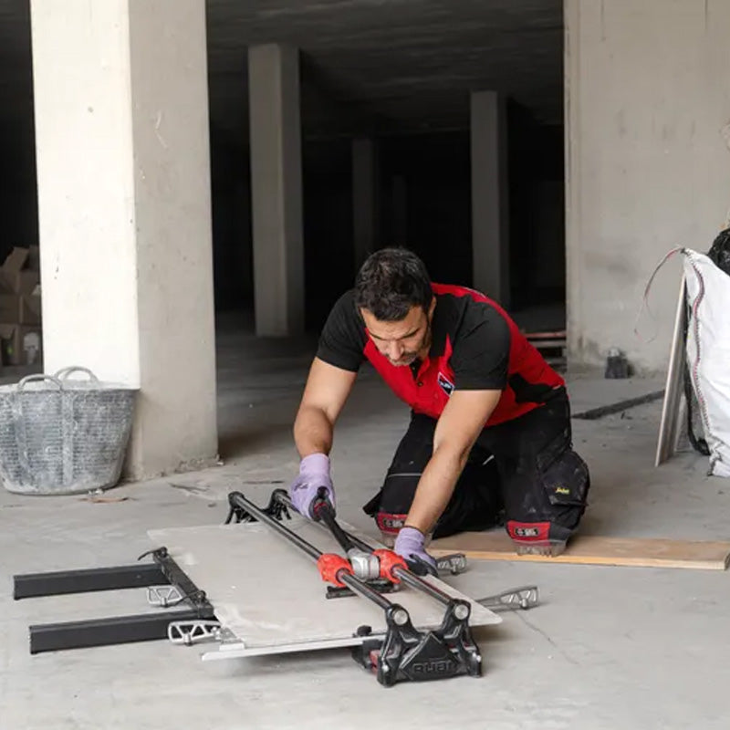 Les bras supplémentaires et le double support garantissent un travail sécurisé sur les carreaux de grand format. La poignée soft grip assure confort et ergonomie, et les roues intégrées facilitent le transport sur le chantier.