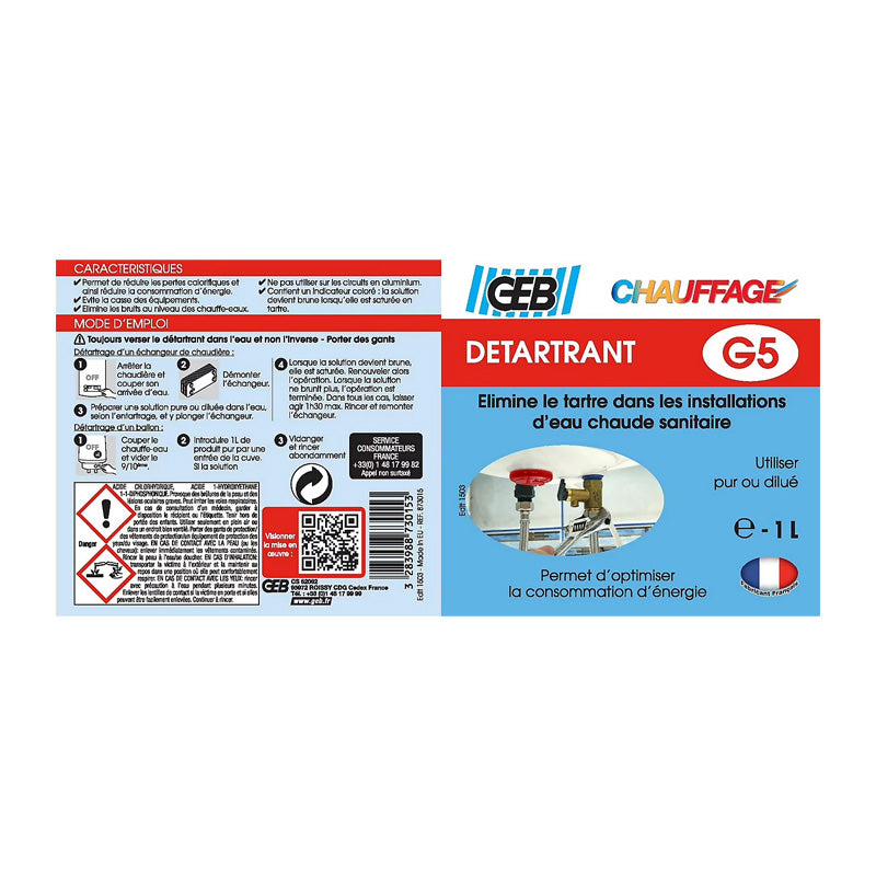 Caractéristiques Détartrant G5 GEB élimine le tartre dans les installations d'eau chaude sanitaire 1L