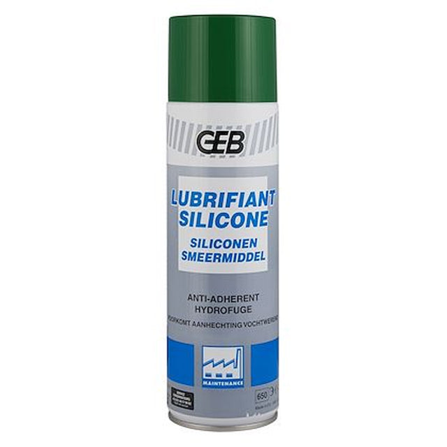 Type de produit : Lubrifiant anti-adhérent. Composition : 100% silicone. Format : Aérosol 500 ml. Marque : GEB. Propriétés : Réduit les frictions, empêche l’adhérence, protège contre la corrosion. Utilisation : Entretien et maintenance de pièces mécaniques, plastiques, caoutchoucs, métaux ou moules industriels.