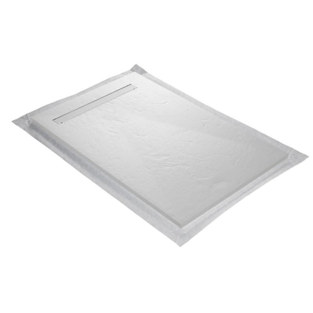 Avantages produit Receveur résine extra-plat MARMOX RC12090LITE-9010-LINE - Grille caniveau excentrée - Natte étanche pré-montée - Blanc imitation ardoise - 120x90cm