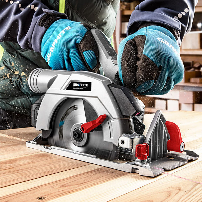 La scie circulaire sans fil Energy+ 18 V 58G023 de GRAPHITE combine puissance, précision et confort pour tous vos travaux de découpe. Son moteur Brushless offre une performance optimale et une longue durée de vie, tandis que la lame de 165 mm permet des coupes nettes dans le bois et d’autres matériaux comme le métal, le plastique, le placoplâtre et les panneaux de particules. La scie est équipée d’un guide parallèle pour des coupes longitudinales précises, d’un réglage facile de l’angle et de la profondeur de coupe sans outils, ainsi que d’une poignée ergonomique et d’un laser pour un guidage précis.