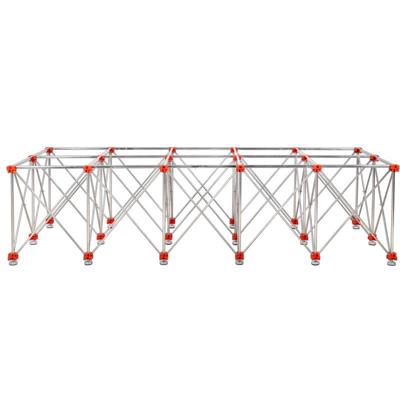 Système de montage et démontage instantané sans outils. Bases filetées réglables pour s’adapter aux irrégularités du sol. Conçue pour limiter l’encombrement une fois repliée et faciliter le transport.
