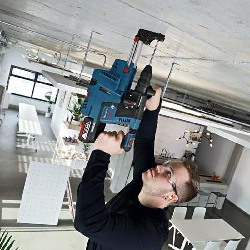 Ce perforateur est destiné aux applications de perçage et burinage dans le béton, la maçonnerie, le bois et le métal. Il est compatible avec divers dispositifs d’aspiration de poussière ainsi qu’avec toutes les batteries et tous les chargeurs 18V de Bosch Professional (Professional 18V System). Également compatible avec AMPShare, l’alliance batteries multimarques.