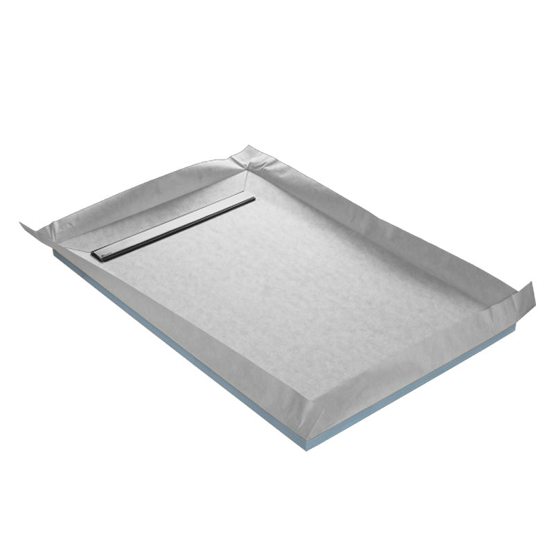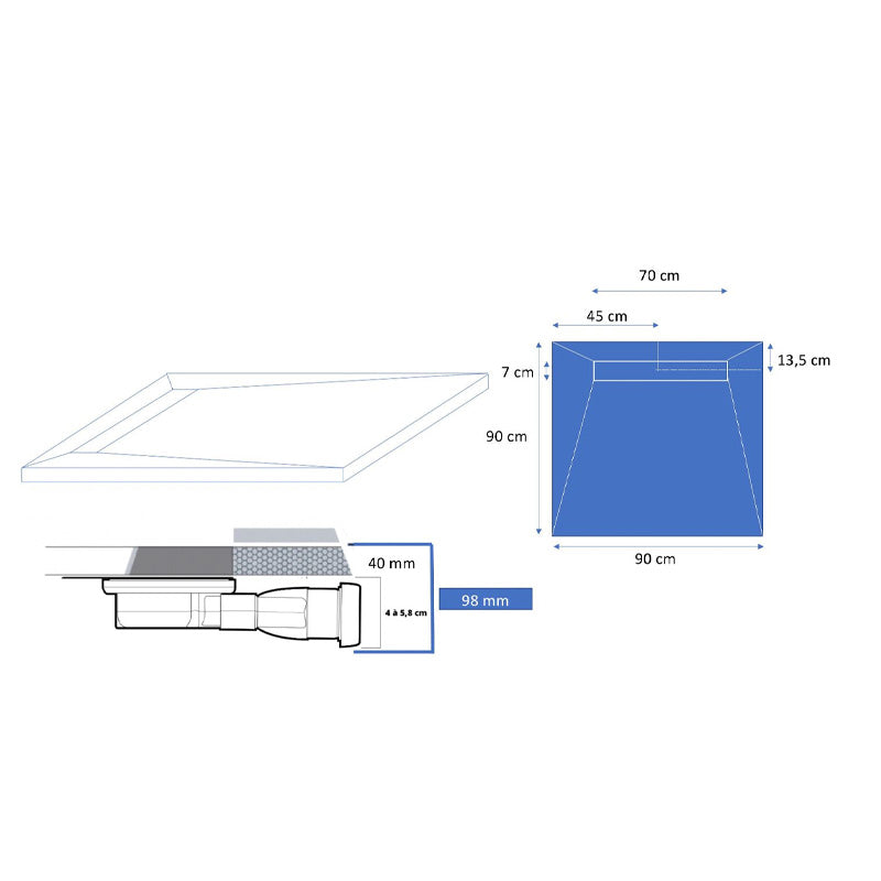 Densité 36 kgs/m3 / Résistance à la compression: 3 tonnes par m2 / Comportement au feu: Classe E / Léger / Extra-plat (40 mm) / Finition caniveau / Recoupable / Modèle quatre pentes / Polystyrène extrudé renforcée avec de la fibre de verre et du mortier polymérisé étanche / Natte étanche pré-montée qui dépasse de 10 cm de chaque côté pour relevé périphérique / Résistance mécanique renforcée / Compatible tous carreaux / Garantit contre le poiconnement / Grille caniveau excentrée / Format de la grille 70 cm par 7 cm / Ajustement de la hauteur de la grille en fonction de la hauteur du carrelage / Evacuation des eaux infiltrées / Garantie 10 ans / Siphon ultra plat / Sortie du siphon 40 mm / Débit 34 litres par minute / Compatible avec grille à carreler sur demande