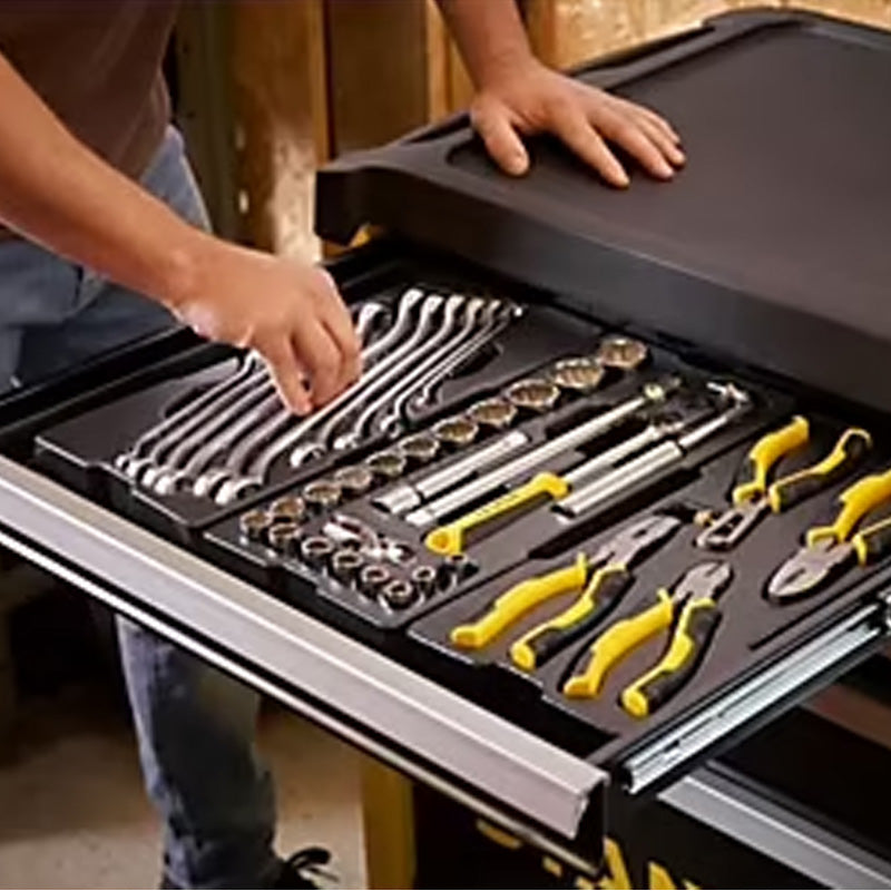 La servante d’atelier STANLEY STST74305-1 allie robustesse, organisation optimale et mobilité. Conçue en acier et polypropylène renforcé, elle dispose de cinq tiroirs de tailles variées pour ranger efficacement outils standards et matériel encombrant. Chaque tiroir repose sur des glissières à billes pour une ouverture fluide et sans claquement, et est équipé d’un tapis de protection.