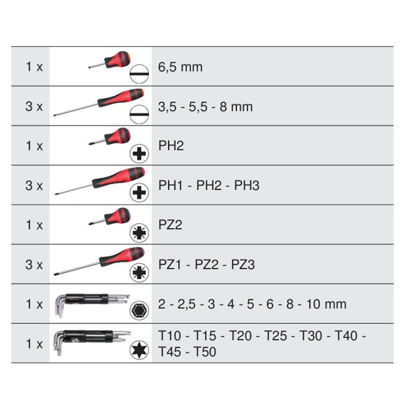 Il inclut une large gamme de clés mâles 6 pans, TORX®, ainsi que des tournevis ULTIMATE (Fente, Phillips®, Pozidriv®, Tom Pouce), idéals pour répondre à toutes les exigences en atelier comme sur chantier. Un indispensable pour tous les professionnels du vissage.