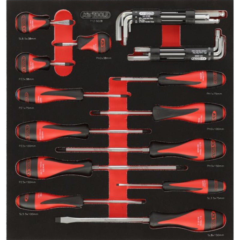 Le module de vissage KS TOOLS 712.5028 rassemble 28 pièces essentielles pour vos opérations de vissage, soigneusement rangées dans une mousse haute qualité, découpée au laser.