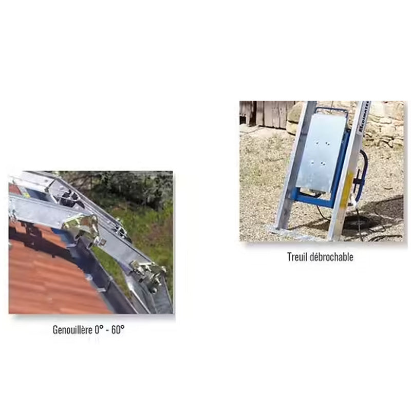 Monte matériaux sur échelle aluminium, usage intensif. Capacité de charge : 150 kg. Treuil 220 V mono, prise 16 A, 2 P+T, câble maxi 40 m Ø 5 mm. Réglage genouillère : 0 à 60°, angle de travail : 30 à 90°.